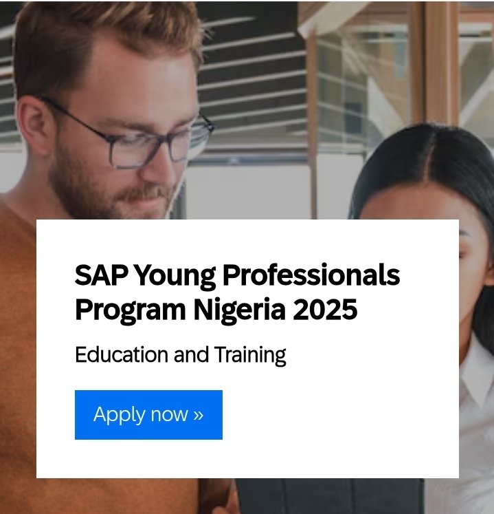 otukama SAP Young Professionals Program Nigeria 2025 Location: Virtual WHAT WE REQUIRE FROM A CANDIDATE: •Candidates must have the legal right to work in Nigeria. •Candidates must be currently unemployed or employed in a part time/non-permanent role not related to career aspirations; •Candidates must be educated to at least Bachelor level in a field related to Business Administration / Management Information Systems / Engineering / Data Science / AI •Candidates will preferably have graduated within the last 3 years with a GPA in the top quartile – proof of this may be requested. •Candidates must have a keen interest in starting an SAP-related career involving travel; •Candidates should be fluent in English, both written and spoken; Apply 👇 https://jobs.sap.com/job/Lagos-SAP-Young-Professionals-Program-Nigeria-2025-101001/1253040301/
