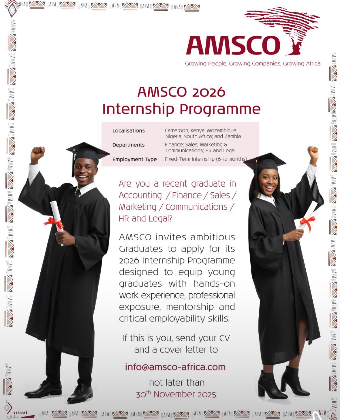 AdrianBryan ๐๐ ๐ฆ๐๐ข ๐ฎ๐ฌ๐ฎ๐ฒ ๐๐ป๐๐ฒ๐ฟ๐ป๐๐ต๐ถ๐ฝ ๐ฃ๐ฟ๐ผ๐ด๐ฟ๐ฎ๐บ! ๐ ๐๐ผ๐ฐ๐ฎ๐๐ถ๐ผ๐ป๐: Cameroon, Kenya, Mozambique, Nigeria, South Africa, Zambia. AMSCO invites talented and motivated graduates to apply for our 2026 Internship Programme โ a unique opportunity to gain hands-on experience, professional mentorship, and industry exposure in: ๐ Accounting & Finance ๐ผ Sales & Marketing ๐ฃ Communication ๐ฅ Human Resources โ Legal If youโre eager to learn, grow, and build a meaningful career, we want to hear from you! ๐ฉ Send your CV and cover letter to ๐ถ๐ป๐ณ๐ผ@๐ฎ๐บ๐๐ฐ๐ผ-๐ฎ๐ณ๐ฟ๐ถ๐ฐ๐ฎ.๐ฐ๐ผ๐บ ๐ ๐๐ฒ๐ฎ๐ฑ๐น๐ถ๐ป๐ฒ: 30th November 2025