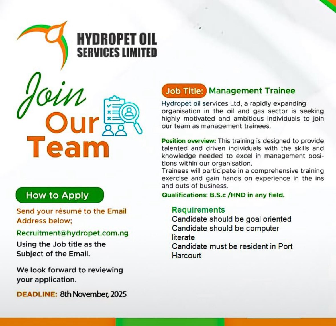 otukama Management Trainee Location: Port Harcourt, Rivers State Employment Type: Full-Time Industry: Oil & Gas / Energy ๐งพ Position Overview: This training is designed to provide talented and driven individuals with the skills and knowledge needed to excel in management positions within our organization. ๐ฏ Requirements: - B.SC/HND in any field - Strong analytical and communication skills - High level of integrity and attention to detail ๐ผ What We Offer: - Competitive salary and benefits - Opportunities for professional growth - A collaborative and innovative work environment - Exposure to industry-leading practices ๐ฌ How to Apply: Send your CV to recruitment@hydropet.com.ng with the subject line: Application for Management Trainee Deadline: 8th November, 2025