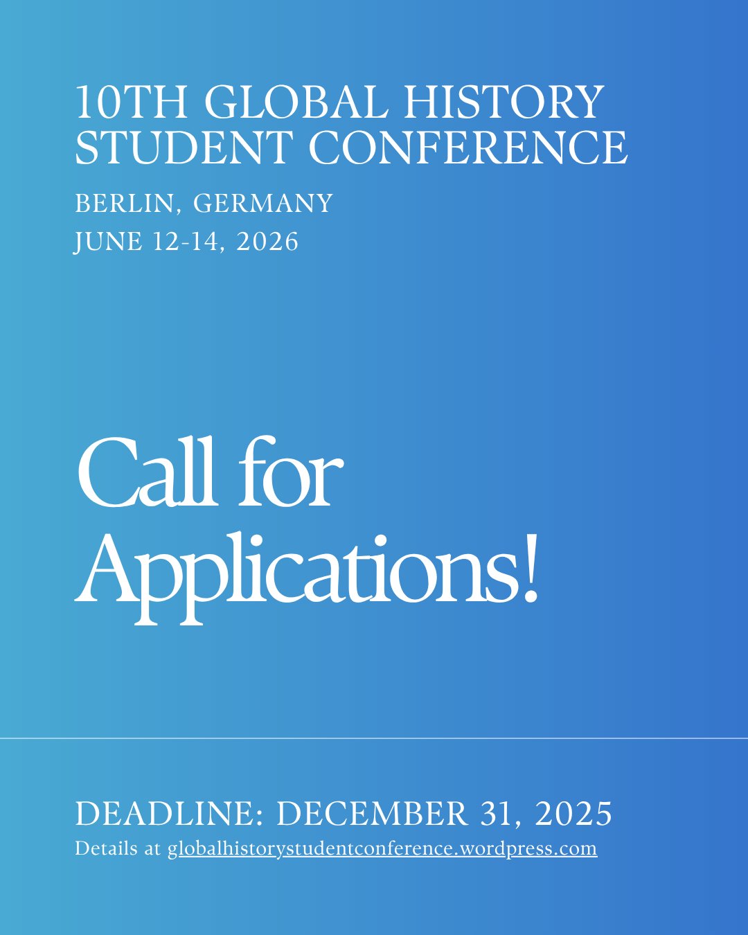 AdrianBryan The 10th Global History Student Conference’s call for applications is now open! 📢Submit your application by December 31, 2025. For more details, see our website: … https://globalhistorystudentconference.wordpress.com/ #ghsc2026 #GHSC #CallForApplications #callforpaper #globalhistory #history