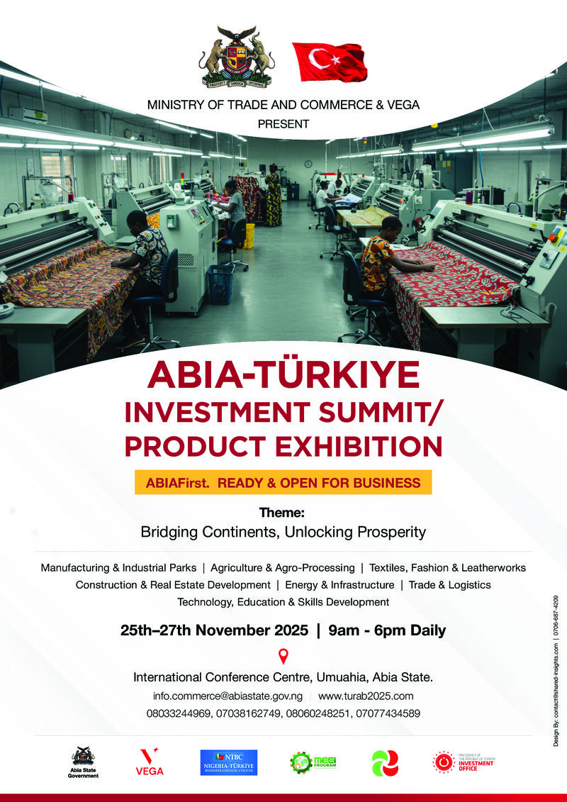igwennannaotu This November 25–27, 2025, the Abia–Türkiye Investment Summit & Product Exhibition will hold at the International Conference Centre, Umuahia. Themed “Bridging Continents, Unlocking Prosperity,” the summit will connect leaders, innovators, and investors from Türkiye and Nigeria across key sectors like manufacturing, agriculture, construction, energy, ICT, trade, and infrastructure development. It is a convergence designed to foster partnerships, drive investment deals, and showcase the finest of products and innovations.
