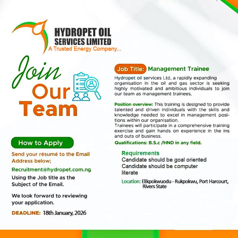 How to Apply: Send your CV to recruitment@hydropet.com.ng with the subject line: Application for Management Trainee