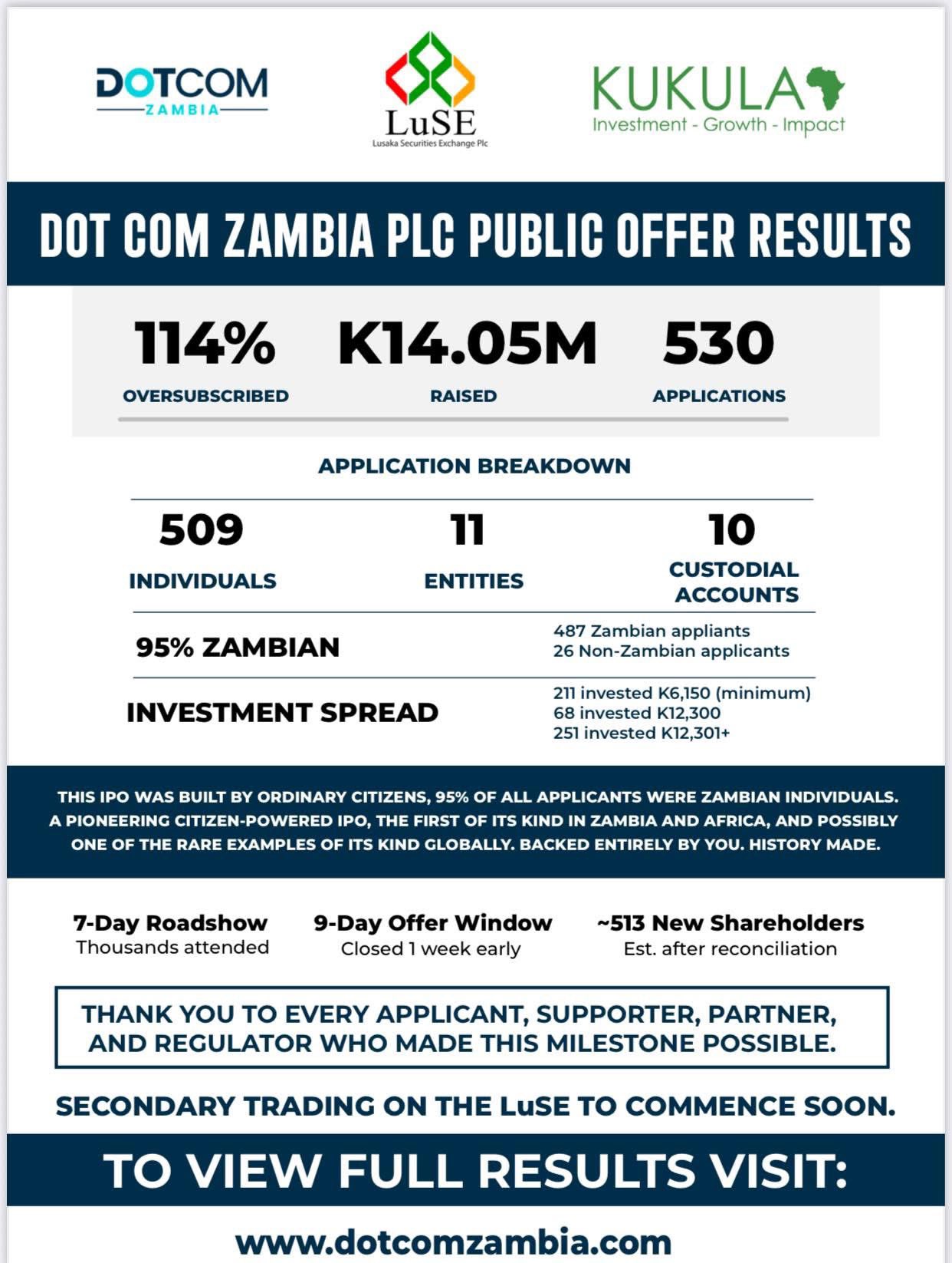 Dotcom Zambia has officially made history, completing Zambia’s first citizen-powered tech IPO on the LuSE Alternative Market. No big institutions. Just everyday Zambians stepping up. And the response? Huge. The IPO was 114% oversubscribed, with over 530 people choosing to own a piece of something proudly homegrown.