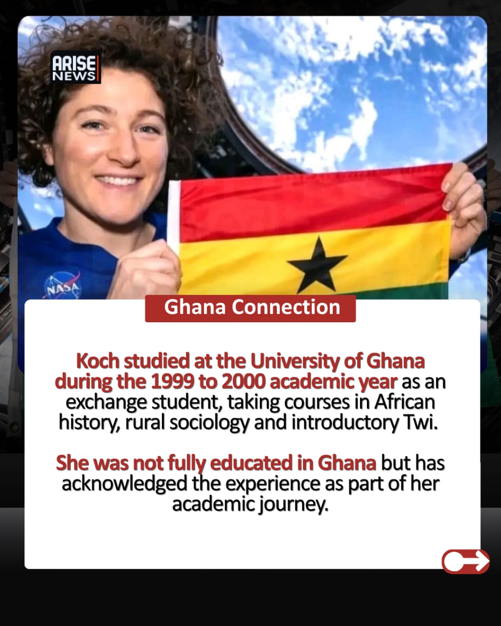 Ghana is set to honour Christina Hammock Koch following her role in the historic Artemis II mission and her academic ties to the country. While she was not fully educated in Ghana, Koch studied at the University of Ghana as an exchange student, a connection she later acknowledged by displaying the Ghanaian flag during the mission.