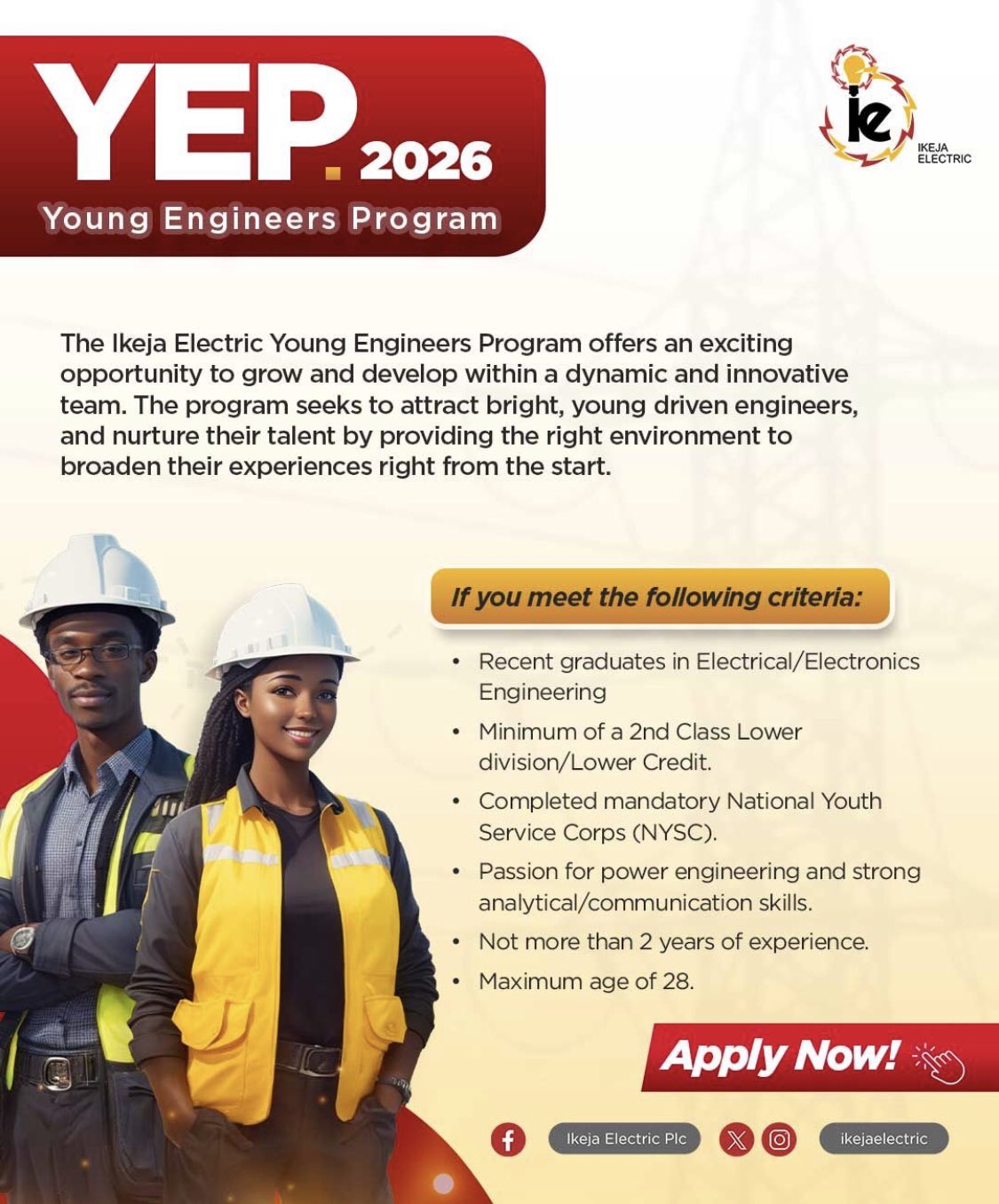 Are you a recent engineering graduate ready to light up Nigeria's energy sector? Ikeja Electric is looking for brilliant young minds to join our 2026 Young Engineers Program – where ambition meets opportunity and potential becomes power.