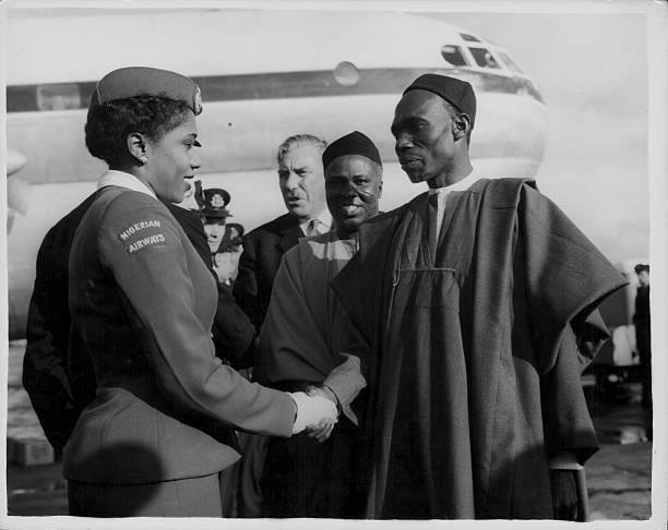 Nigeria’s first Air Hostess, 28-year-old Miss Christina Eyimofe Tugele, shakes hands with Nigeria's first and only Prime Minister, Sir Abubakar Tafawa Balewa, as the Honourable Minister for Aviation, Chief Samuel Ladoke Akintola, and Nigeria's last colonial Governor-General, Sir James Robertson, look on, after the maiden flight of the West African Airways Corporation Nigeria Limited (WAAC Nigeria), also known as Nigeria Airways, October 1, 1958. #HistoryVille Image Credit: ASIRI Magazine