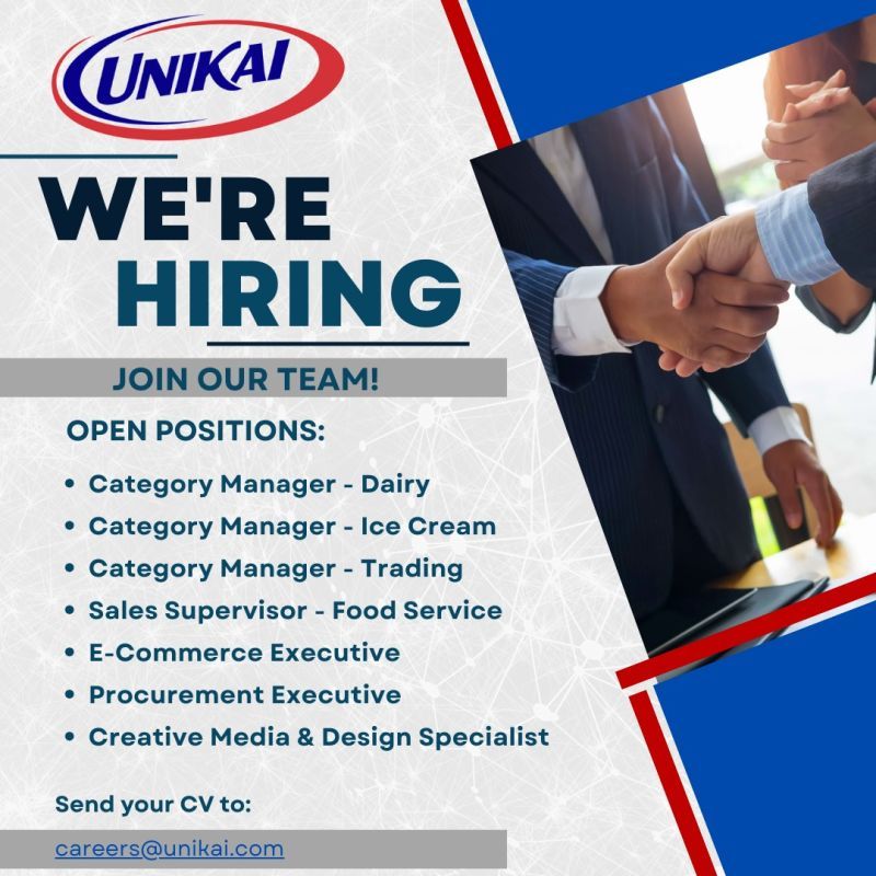 Multiple Job Openings | Great Culture | Career Growth 🌟Are you ready to take the next step in your career? We’re expanding and looking for dedicated, talented, and driven individuals to join our team! Share updated CV to careers@unikai.com Email subject must be as per the job vacancy, ex. "E-Commerce Executive" **Due to the high volume of applications, kindly note that only candidates who have been selected for further consideration will be contacted**