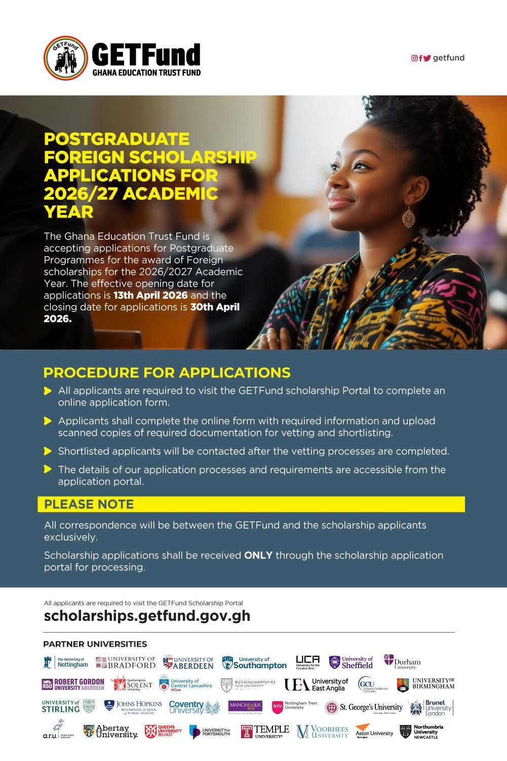 The Ghana Education Trust Fund is accepting applications for Postgraduate Programmes for the award of Foreign scholarships for the 2026/2027 Academic Year.
