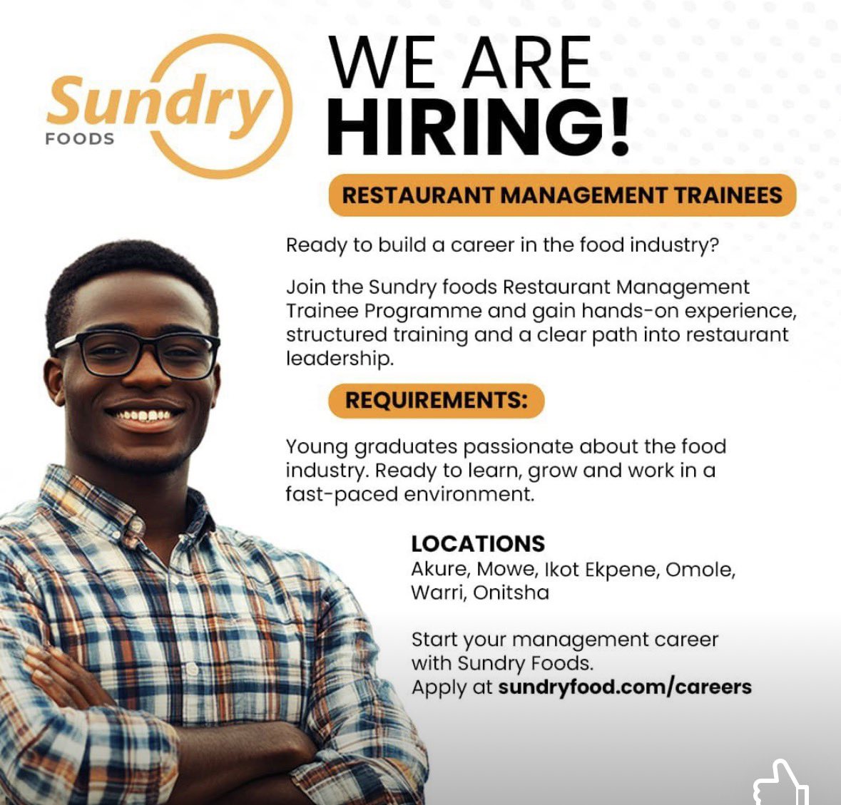 Sundry Foods is recruiting 𝐑𝐞𝐬𝐭𝐚𝐮𝐫𝐚𝐧𝐭 𝐌𝐚𝐧𝐚𝐠𝐞𝐦𝐞𝐧𝐭 𝐓𝐫𝐚𝐢𝐧𝐞𝐞𝐬 who are hungry to learn, grow, and lead in a fast-paced industry.