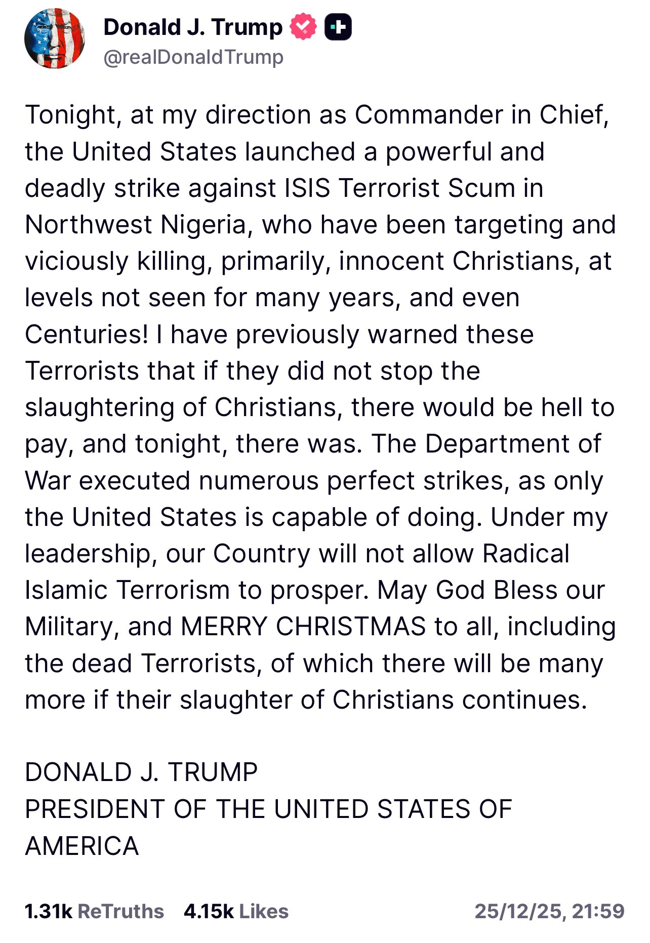 The United States launched military strikes in Nigeria against Islamic State insurgents, whom President Trump has accused of slaughtering Christians. U.S. missiles struck insurgents in two ISIS camps in northwestern Nigeria’s Sokoto State, according to a U.S. military official, who spoke on condition of anonymity. The operation was done in coordination with the Nigerian military, the official said.