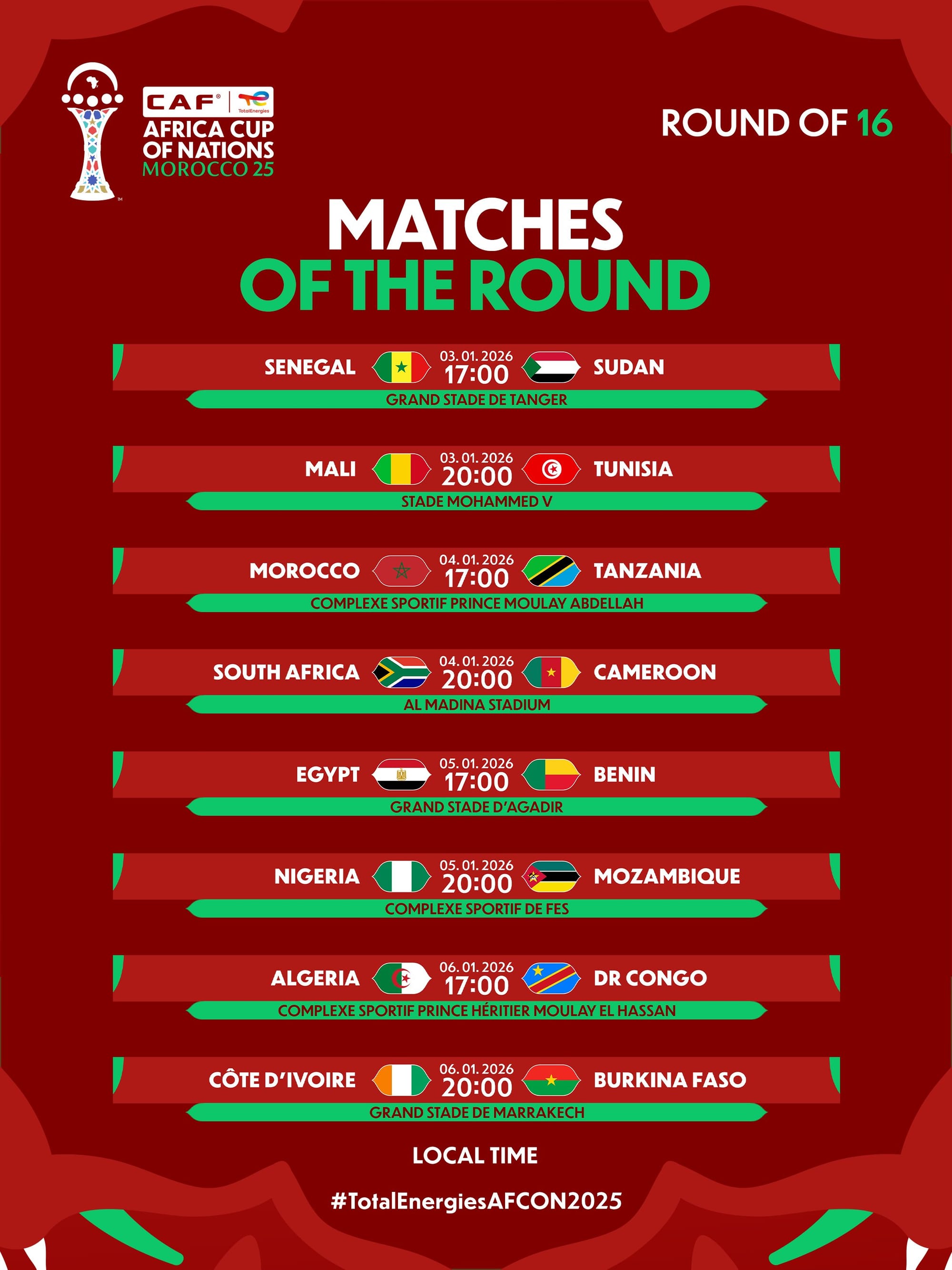 #TotalEnergiesAFCON2025 round of 16 fixtures.