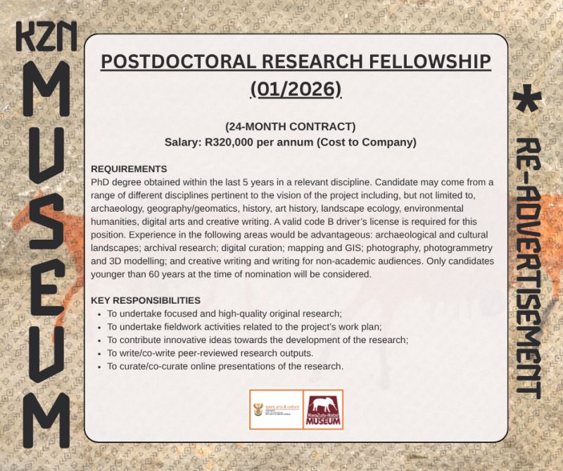 📢 VACANCY – Postdoctoral Research Fellowship (01/2026) Re-Advertisement KwaZulu-Natal Museum (Pietermaritzburg)